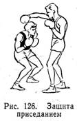Из наступательной позиции боксер быстро приседает на полные ступни ног, заставляя противника промахнуться. Руки, согнутые в локтевых суставах под острым углом, слегка прижаты к туловищу (рис. 126).