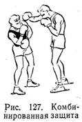 ладони, подставку предплечья левой руки, согнутой в локтевом суставе и прикрывающей туловище (рис. 127); от ударов левой — небольшой отклон назад, уклон влево, подставку правого плеча, подставку левой ладони, подставку предплечья правой руки, согнутой в локтевом суставе и прикрывающей туловище.