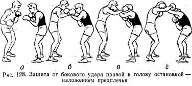 От удара правой — из наступательной или активнозащитной позиции боксер останавливает удар, накладывая предплечье левой руки на двуглавую мышцу бьющей руки в начале ее движения. Одновременно он прижимает подбородок к груди, кистью правой руки, согнутой в локтевом суставе под острым углом, защищает голову, а опущенным локтем — туловище (рис. 128).
