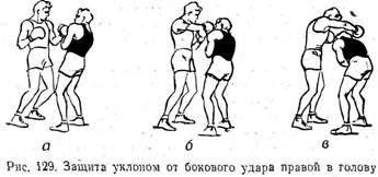 Защита уклоном от бокового удара правой в голову. Из наступательной позиции боксер в одном слитном движении быстро поворачивает туловище слева направо и наклоняет его несколько вперед и вниз. Левую руку, согнутую в локтевом суставе под острым углом, слегка прижимает к туловищу, кистью правой руки защищает голову, а локтем — туловище (рис. 129).