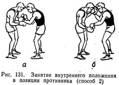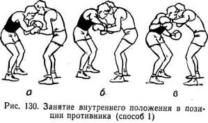 Занятие руками внутреннего положения. Внутреннее положение рук в позиции противника выгодно для успешного и беспрепятственного нанесения ударов в туловище и голову. Чтобы занять такое положение в ближнем бою применяют четыре способа: