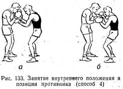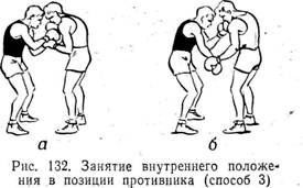 3. Боксер накладывает сбоку кисть левой руки на запястье правой руки противника, одновременно вводит снизу кисть правой руки и разводит его руки в стороны, стремительно нанося затем удар левой снизу в туловище или короткий прямой (боковой) удар правой в голову (рис. 132).