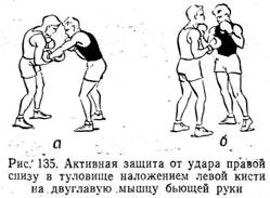 Активная защита от удара левой снизу в туловище. От удара левой снизу в туловище применяют три аналогичные описанным активные защиты.