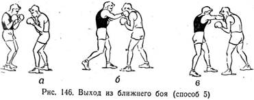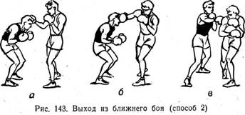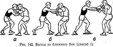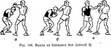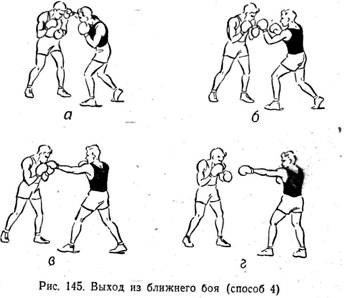 Выход из ближнего боя. В состязаниях в определенные моменты бывает невыгодно вести ближний бой. Когда боксер чувствует физическое превосходство противника в ближнем бою, а различные контрмеры не дают возможности перехватить инициативу и добиться преимущества, в таких случаях или по другим причинам боксеру следует выйти из ближнего боя. Делает он это следующими способами: