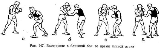 Вхождение в ближний бой во время личной атаки прямыми, боковыми и ударами снизу боксеры осуществляют: