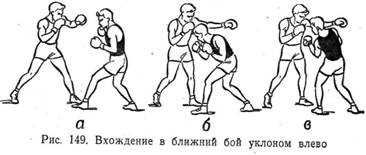 5) уклоном влево и ударом левой снизу в туловище (рис. 149);