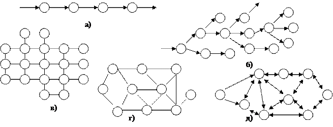 Рис. 3.6. Графы, соответствующие различным структурам: а) линейная; б) древовидная (иерархическая); в) матричная; г) сетевая (в технических системах); д) с обратными связями (кольцевые пути в ориентированных графах)