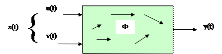 Рассматривая выход у(t) системы (это может быть вектор) как ее реакцию на управляемые u(t) и неуправляемые v(t) входы х(t) = {u(t), v(t)} (рис. 3.7), можно модель “черного ящика” выразить как совокупность двух процессов: Х = {х(t)} и Y = {y(t)}, t Î Т. Если даже считать у(t) результатом некоторого преобразования Ф процесса х(t), т.е. у(t) = Ф(х(t)), то модель «черного ящика» предполагает, что это преобразование неизвестно. В случае «белого ящика», соответствие между входом и выходом можно описать тем или иным способом, который зависит от того, что нам известно, и в какой форме можно использовать эти знания.