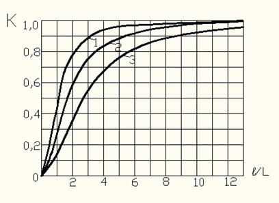 Рис.13. График для определения коэффициента К. 1- алюминий и асбестоцемент; 2- стеклопластик; 3- фанера.