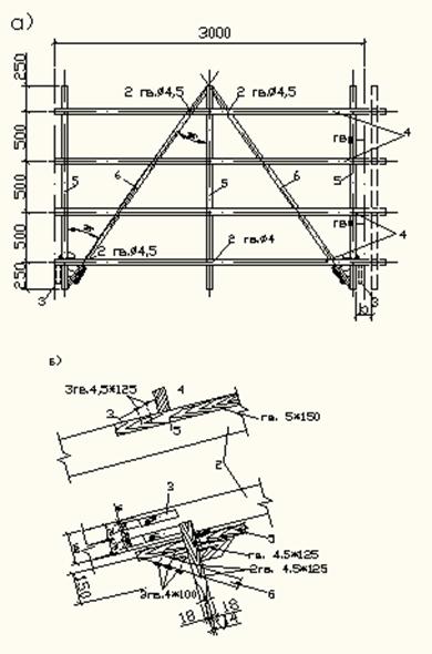Рис.14. Беспрогонное решение покрытия стандартными щитами обрешётки. а)- щит настила; б)- деталь крепления щита к верхнему поясу фермы; 1-ось фермы; 2- верхний пояс фермы; 3- прибоина; 4- обрешётины сечением 50х100 мм; 5- поперечины 50х50 мм; 6- раскосы 50х50 мм.