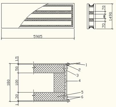 1- Выпуск; 2- алюминиевый уголок; 3- алюминиевый лист; 4-бакелизированная фанера; 5- ДВП; 6- заклёпки.