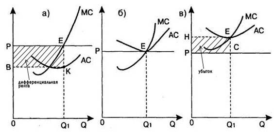 На лучшем участке (а) будет получена дифференциальная рента (прямоугольник ВРЕК); на среднем участке (б) производственные издержки будут лишь компенсированы; на худшем участке (в) образуется убыток.