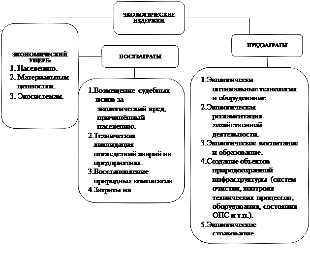 Экологический ущерб во многих случаях можно предотвратить, однако для этого необходимо производить финансовые вливания (предзатраты). В том случае, если предзатраты не имели места быть, возрастает вероятность возникновения экологического ущерба, что повлечёт за собой финансовые потери или постзатраты (рисунок 3).