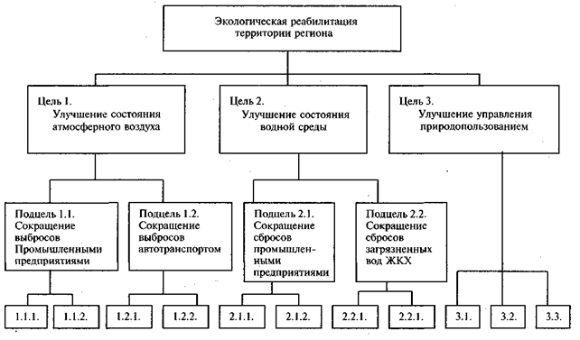 Распределение бюджетных средств, направленных на природоохранные мероприятия, по соответствующим направлениям возможно с помощью структурно-целевой модели (метода экспертных оценок). Структурно-целевая модель включает на первом уровне, в качестве подцели главной цели, такие подцели, как улучшение состояния первичных и вторичных сред. Экспертная оценка показывает вклад каждой из сред в реализацию поставленной цели, причем при формулировке и структуризации целей предполагается полное их достижение. На рисунке 5 приведено дерево целей (структурно-целевая модель) для экологической реабилитации региона, в котором на первом уровне выделены три важнейшие цели: улучшение состояния атмосферного воздуха (цель 1), улучшение состояния водной среды (цель 2) и улучшение управления природопользованием (цель 3). Цель 1 достигается за счет реализации двух подцелей: 1.1 - сокращение выбросов в атмосферный воздух вредных веществ промышленными предприятиями; 1.2 - сокращение выбросов вредных веществ автотранспортом. Цель 2 - за счет реализации подцелей 2.1 - сокращение сбросов загрязненных сточных вод промышленными предприятиями и 2.2 - сокращение сбросов загрязненных сточных вод предприятиями ЖКХ. Цель 3 на подцели в данном дереве не делится. К висячим целям (подцелям) подведены мероприятия. Так, например, подцель 1.1 реализуется за счет выполнения двух мероприятий - 1.1.1 и 1.1.2, а цель 3 - за счет трех мероприятий 3.1, 3.2, 3.3.