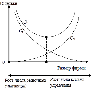| При этом, C Σ = С т + С у – суммарные затраты на транзакции и административное управление при наличии в экономике одновременно и того и другого. Как видно из рисунка, оба крайних варианта имеют непомерно большие для экономики издержки. В промежуточных состояниях экономики суммарные издержки C Σ уменьшаются. Точка минимума этих издержек определяет оптимальное сочетание рыночных транзакций и внутрифирменного административного управления, а следовательно, и оптимальные размеры фирмы. |