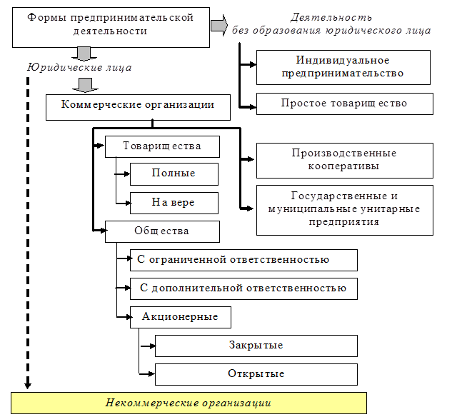 Правовые формы предпринимательской деятельности определены ГК РФ. Как видно из рис. 2.5, предпринимательская деятельность может осуществляться как без образования юридического лица, так и с его образованием.