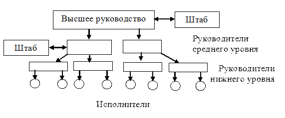 Управленческие решения принимают линейные руководители. Это позволяет повысить качество принимаемых управленческих решений, поскольку в их подготовке участвуют представители штаба, т.е. квалифицированные специалисты по определенным сферам деятельности (юридической, маркетинговой, финансовой и т.п.), однако лишь частично разгружают линейных руководителей.