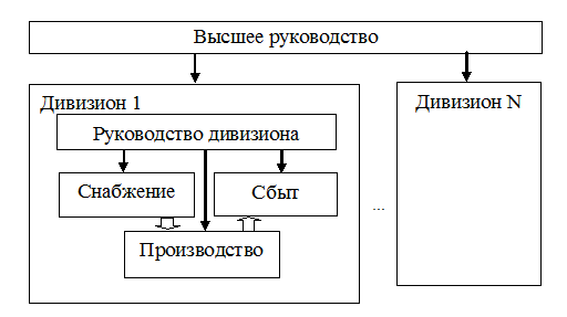 В этой структуре все полномочия по руководству производством и сбытом какого-либо продукта (групп однородных продуктов и услуг) передаются руководству дивизиона, который ответственен перед высшим руководством за выполнение установленных финансовых показателей. Дивизион располагает выделенными для этого ресурсами, обладает полномочиями по развитию и производству продуктов (услуг), соответствующих его специализации, по созданию функциональных служб, подчиненных руководству дивизиона.