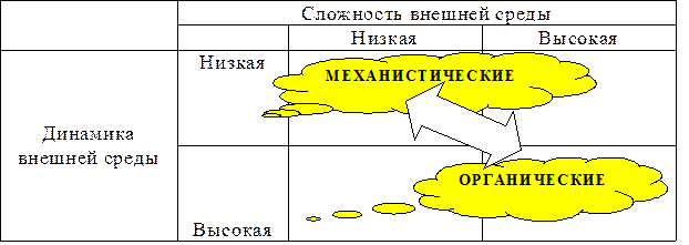 В условиях сложной и динамично изменяющейся внешней среды практически невозможно возникающие проблемы и требуемые действия разложить на отдельные элементы и распределить по специалистам. Поэтому организационные структуры должны адаптироваться к нестабильным и постоянно меняющимся условиям.