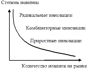 Рис. 4.1 | Практика показывает, что в любой момент на рынке возникают радикально новые инновации, но их число невелико, в то время как подавляющая часть инноваций является приростными. Связь количества инноваций на рынке со степенью их новизны иллюстрирует рис. 4.1. |