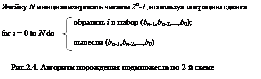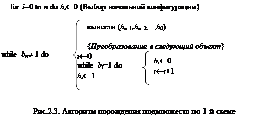 Наиболее прямым способом порождения всех двоичных наборов длины n является счет в системе счисления с основанием 2, что реализует алгоритм представленный на рис.2.3.