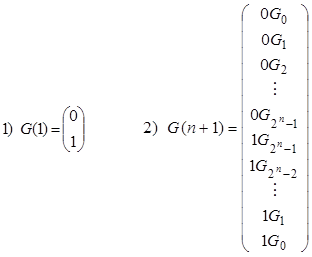 есть n -разрядный код Грея, записанный в форме двоичной 2 n ´ n матрицы так, что 1-я строка матрицы является 1-м кодовым словом - Gi. Дадим рекурсивное определение кода