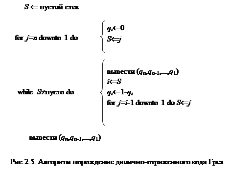 Итак, для порождения кода Грея достаточно уметь порождать последовательность его переходов. Последовательность переходов можно порождать итеративно, используя стек. Вначале стек содержит элементы n, n -1,...,1 (с 1 в вершине). Затем верхний элемент стека – i выталкивается и помещается в последовательность переходов, после этого в стек добавляются элементы i -1, i -2,...,1. Процесс повторяется пока стек не пуст. Алгоритм порождения кода Грея представлен на рис.2.5.