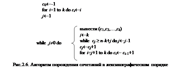 Сочетания в лексикографическом порядке можно порождать следующим образом. Начиная с сочетания (1,2,..., k), следующее сочетание находится просмотром текущего сочетания справа налево с тем, чтобы определить место самого правого элемента, который не достиг еще своего максимального значения. Этот элемент увеличивается на единицу, и всем элементам справа от него присваиваются новые наименьшие возможные значения. Алгоритм порождения сочетаний в лексикографическом порядке представлен на рис.2.6.