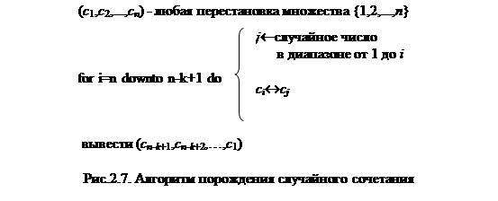 Эффективный метод порождения случайных сочетаний из n по k осуществляют случайные перестановки на первых k местах множества. Алгоритм порождения случайных сочетаний представлен на рис.2.7.