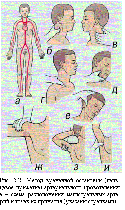 | Однако, при сильном артериальном или смешанном кровотечении этого недостаточно. В подобных случаях могут быть использованы другие способы: пальцевое прижатие артерии, наложение кровоостанавливающего жгута или форсированное сгибание конечности. Самым доступным из них является прижатие артерии выше раны, из которой истекает кровь. Для этого необходимо знать точки, в которых артерии могут быть прижаты к кости (рис. 5.2.). Как правило, в них удается прощупать пульсацию артерий. Прижатие артерии пальцем или кулаком обеспечивает почти мгновенную остановку кровотечения. Однако даже очень хорошо физически развитый человек не может достаточно долго продолжать прижатие, т.к. уже через 10—15 мин руки начинают уставать, и давление ослабевает. В связи с этим сразу же после прижатия артерии нужно предпринять попытку остановки кровотечения другим способом. Чаще для этой цели используется кровоостанавливающий жгут. После наложения жгута кровотечение должно остановиться, но если оно продолжается, то жгут нужно снять и наложить вновь, отступив выше места его первоначального наложения. После наложения жгута надежно прикрепить к нему записку с указанием времени, даты наложения, фамилии и должности спасателя. | |