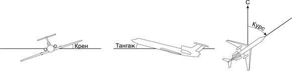 Поскольку пространство трехмерно, ВС, как и любое тело, можно вращать вокруг трех перпендикулярных осей. Поэтому угловое положение ВС характеризуют три величины: крен, тангаж и курс (рис.2.23).