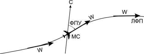 Очевидно, что вектор путевой скорости W направлен по направлению ЛФП в данной точке. Если ЛФП кривая, за ее направление принимается направление касательной к ней. Действительно, ведь за счет W место самолета и перемещается, описывая ЛФП. Поэтому ФПУ можно определить также как угол, заключенный между северным направлением меридиана и направлением ЛФП в данной точке.