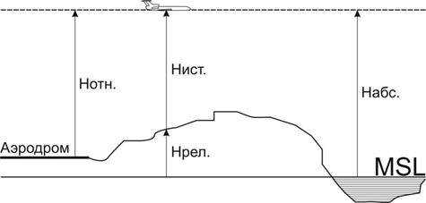 3. Относительная высота Нотн измеряется от любого выбранного в качестве начала отсчета уровня. В большинстве случаев под относительной высотой полета ВС понимается высота над уровнем аэродрома.