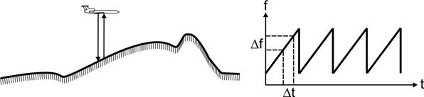 Бортовой передатчик, входящий в состав РВ, излучает направленные к земле радиоволны, которые отражаются от ее поверхности и принимаются антенной РВ. Но частота излучения не является постоянной, а непрерывно изменяется по пилообразному закону. Например, равномерно возрастает, затем резко уменьшается до начального значения и вновь начинает возрастать (рис. 6.2).