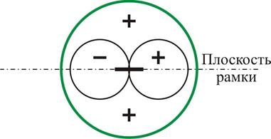 Если нарисовать график зависимости ЭДС от угла в полярных координатах, то он будет иметь вид восьмерки. Из него видно, что максимальная по амплитуде ЭДС имеет место, когда направление на РНТ лежит в плоскости рамки – в ту или другую стороны. Но в зависимости от того, в какую именно (вправо или влево на рис. 3.6) фаза ЭДС будет различаться на 180º, в зависимости от того, какой из двух ветвей рамки радиоволна достигла первой. Это условно помечено знаком плюс и минус.