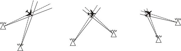 Рис. 3.42. Влияние угла пересечения ЛРПС на точность определения МС