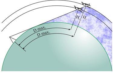 Анализ формулы (2.2) показывает, что дальность зависит как от высоты антенны радиомаяка, так и от высоты полета ВС. Первое слагаемое в скобках обычно гораздо меньше, чем второе, поэтому при приближенных расчетах им можно пренебречь и считать, что Dmax определяется полностью высотой полета. Но в формулу входит квадратный корень высоты. Это значит, что для увеличения дальности вдвое следует подняться в четыре раза выше.