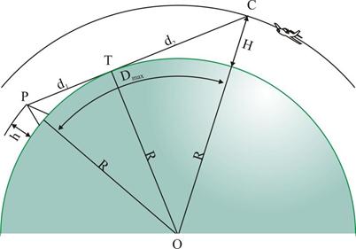 ВС окажется в поле видимости радиомаяка только тогда, когда оно окажется в точке C, и только тогда может быть принят сигнал от радиомаяка. Максимальная дальность Dmax, конечно, отсчитывается вдоль поверхности земли, но высоты h и H настолько малы по сравнению с радиусом Земли R (на рисунке они сильно преувеличены), что с высокой точностью можно считать, что Dmax совпадает с длиной прямой PC. Эта прямая складывается из участка PT, от радиомаяка до точки касания (обозначим ее длину d1), и участка TC, от точки касания до точки C (это точка выхода ВС из тени), длиной d2.
