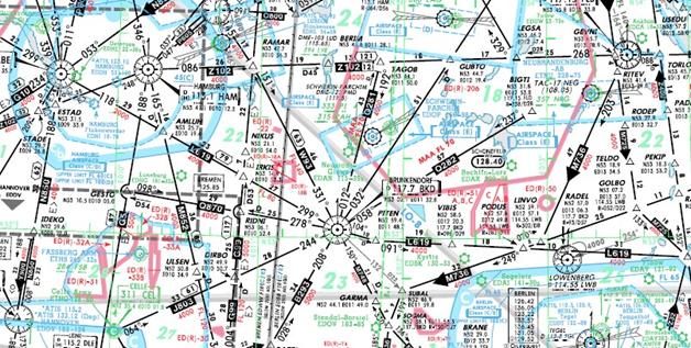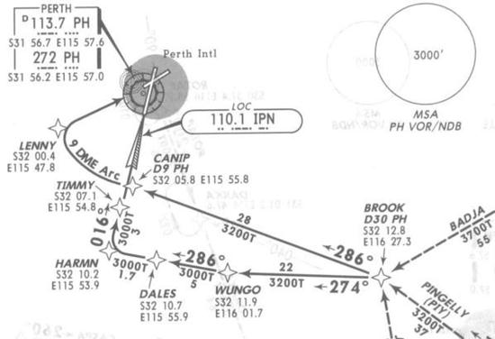 Поэтому за рубежом обычные маршруты (conventional route), то есть не являющиеся маршрутами зональной навигации, проходят через навигационные средства, обычно через радиомаяки VOR. В этом случае полет всегда протекает «на» радиомаяк или «от» него и при наличии наведения. В этом легко убедиться, посмотрев на зарубежные маршрутные карты (рис.11.1). Вот такая навигация и считается обычной, то есть не зональной. И в некоторых зарубежных учебниках аэронавигации само определение навигации дается примерно такое: «навигация, это способ, с помощью которого обеспечивается наведение по линии пути».