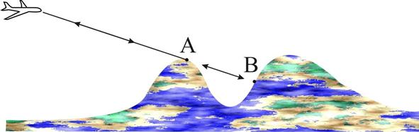 Горная и пересеченная местность будет видна в виде пёстрых светлых и темных пятен. Темные пятна образуются из-за затенения объектов. Ведь локатор «видит» местность не так, как человеческий глаз. Если пилот будет смотреть на местность с ВС как это показано на рис. 9.8, то ближняя к нему гора будет видна на фоне дальней и точка А будет видна непосредственно рядом с точкой В. Но на экране БРЛС расположение точек зависит от удаления до них. На соответствующем удалении от центра экрана будет видна точка А, и на значительно большем удалении точка В. А между ними экран будет темным, ведь никакой отраженный сигнал не пришел с удалений от А до В. Такие темные пятна можно спутать с озерами. Отличить же от озер такие затененные области можно благодаря изменению их формы при движении самолета.