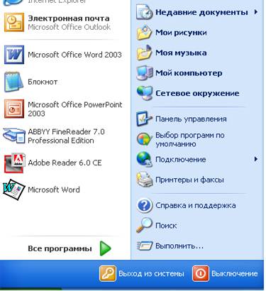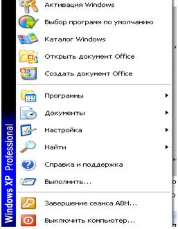 б) середньої, склад якої визначається операційною системою і містить групи Программы, Документы, Настройка, Найти, Справка и поддержка, Выполнить. Кожна з цих груп має своє призначення. Вміст груп Программы та Избранное може корегуватися користувачем.