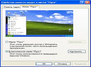 Переключення вигляду головного меню проводиться через панель управління піктограма Панель задач и меню Пуск, або з головного меню пункт Настройки команда Панель задач и меню Пуск, вкладка Меню Пуск (рис. 3).