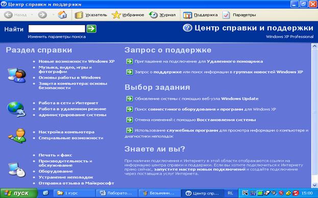 Пункт Справка и поддержка надає інформацію про WINDOWS ХР. Вікно представлене на рис. 4.