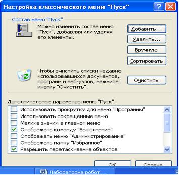 У діалоговому вікні, що з’явиться, перейти на вкладку меню Пуск (рис. 3), та натиснути кнопку Настроить (рис. 5). Зверніть увагу на поле налагодження параметрів, а потім кнопку Добавить. За допомогою кнопки Обзор укажіть каталог програми або пусковий її файл (рис. 6). Натисніть кнопку ОК та вкажіть майбутнє місце розташування звернення до нього (рис. 7), і на завершення залишається дати нову зручну назву цього об’єкта (можна залишити і стару). Для включення в меню створеного об’єкта потрібно натиснути кнопку Готово.