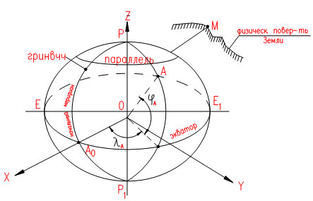 Плоскость экватора проходит через центр эллипсоида О перпендикулярно его оси вращения Р Р1.