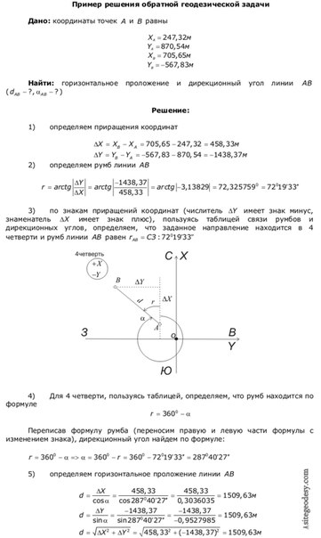 В данном случае искомые величины рассчитываются с помощью вычисления румба и расстояния между заданными точками. При этом угол дирекции находится по четверти системы координат, в которой размещены искомые позиции.