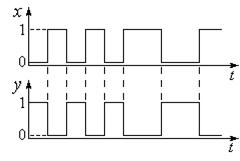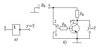 Входной сигнал х состоит из последовательности логических нулей и логических единиц 1. Выходной сигнал также принимает значения логических нулей и логических единиц, но инверсных. Если на входе логический нуль х = 0, то на выходе логическая единица у = 1 и, наоборот, если на входе схемы х = 1, то на выходе логический нуль у = 0.
