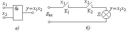 Лампа Л будет светиться (у = 1) только тогда, когда и контакт К1, и контакт К2 будут замкнуты, т.е. находиться в единичном состоянии. Если хотя бы один