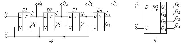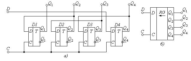 На рис. 14.1 дана схема и условное обозначение четырёхразрядного регистра сдвига вправо на D -триггерах.