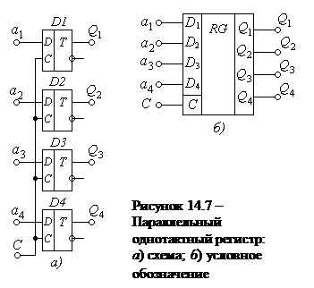 На рис. 14.7 приведена схема четырехразрядного однотактного параллельного регистра памяти на четырёх D -триггерах.